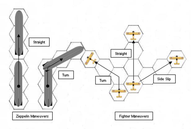 Zeppelins Move: Zeppelins can move forward (or backward) three hexes. Compared to the smaller biplanes, zeppelins were slow to turn. When turning, zeppelins first move forward one hex, pivot 60 degrees, then move only one more hex forward. Zeppelins cannot side slip. Movement is counted from the center of the zeppelin.