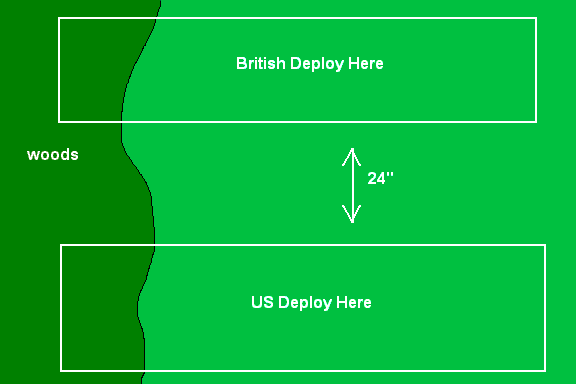 Deployment: The US and British deploy as shown on the map. Only Militia, Native Warriors, and British Light Infantry may start in the woods.