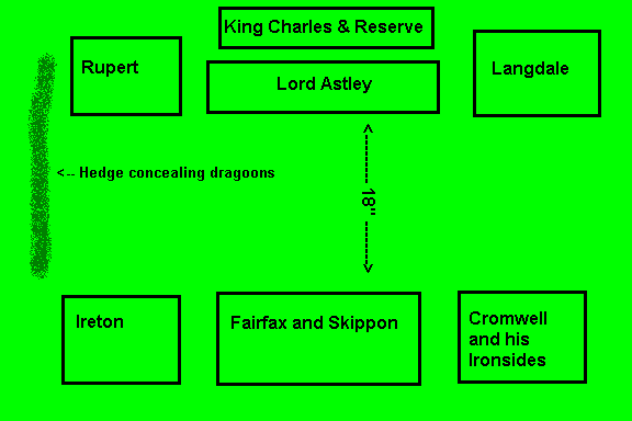 Dragoons Behind the Hedge: The Parliamentarians deployed some dragoons behind the hedge which was on Prince Rupert's right flank. The hedge is an impediment to movement. Units may move and shoot through the hedge, but they cannot charge through it. The dragoons can be considered to be concealed and left off the table until they shoot or move, and reveal their presence.
