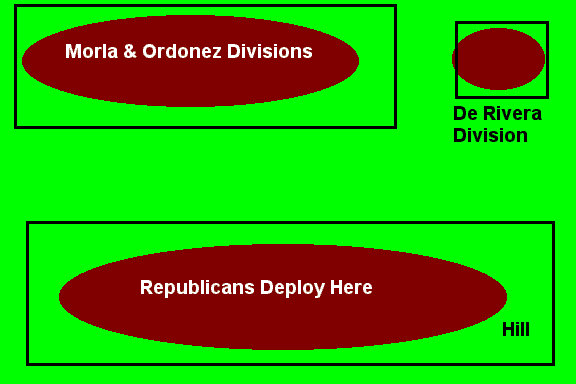 Deployment: Republican and Royalist forces deploy as shown on the map. The De Rivera Division was deployed on a hill on the extreme left of the Royalist army, some distance from the rest of main force. No unit can start closer than 18" from the enemy.