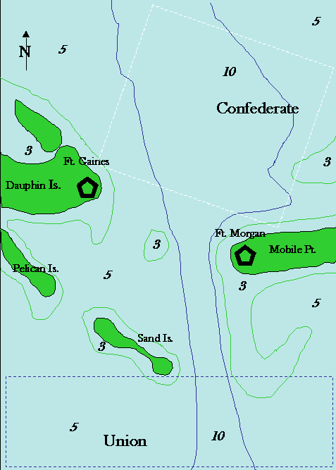 The game is played on a 5' x 7 ½' table covered with blue cloth. Green felt shapes can be cut out to represent Mobile Point, Dauphin, Pelican and Sand Islands. Place Forts Morgan and Gaines on Mobile Point and Dauphin Is. respectively. Blue yarn is taped down to mark the boundary between deep water (10+ feet) and shallow 5 foot water. Green yarn is used to mark the boundary between shallow 5 foot water and 3 foot shoal water. If any part of a ship base touches the yarn, it is considered to be in the shallower water for grounding purposes. Place the Confederate navy anywhere north of Forts Morgan and Gaines. Place the Northern navy anywhere south of the Sand Is.