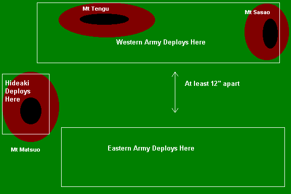 Deployment: The Eastern and Western armies deploy in the boxes indicated on the map. The archers and arquebusiers should be in front. Kobayakawa Hideaki and his army deploy on Mt. Matsuo, as indicated on the map. Each army should have a headquarters for their overall commander.