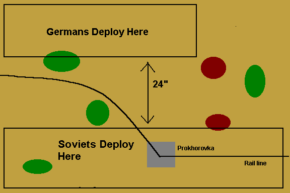 The Map: The battle was played on a 4' x 6' table. The battlefield is mostly open ground. The woods, hills, and village of Prokhorovka should be represented on the battlefield. They can be drawn with marker, outlined in felt, or modeled in detail. The rail line and Psel River did not have much effect on the battle, and don't have to be modeled.