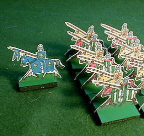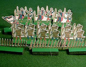 The Miniatures: The figures used were 1/72-scale plastics mounted two per stand, a mix from several sets. Most of the figures were from Revell's English Men at Arms and French Knights. Italeri also has a box of French Hundred Years War soldiers. It's difficult to get enough longbow men for this battle. Matt Driedger reports that the old Airfix Robin Hood set includes 17 archers, and several other figures that can be converted to archers. You may have to substitute, or mount them one figure per stand. All units were six stands in size - 3 stands in the front rank, three in the rear rank. Here are some paper soldiers you can print and use.
