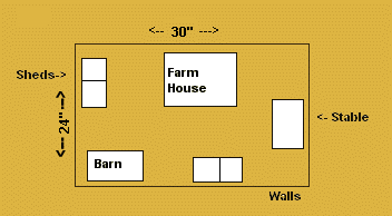 Building the Walled Farm: The outlines of the farm could be drawn in marker, or modeled with pieces of felt or other fabric. Cardboard boxes or foamcore structures can be used for a three dimensional battlefield. A nice rough adobe look can be achieved by covering the structures with spackling compound then spray painting them. Here's a paper wall section you can print and use. These rules will assume that the FFL has had time to barricade the gates and breach in the wall, and to loophole the walls and structures.