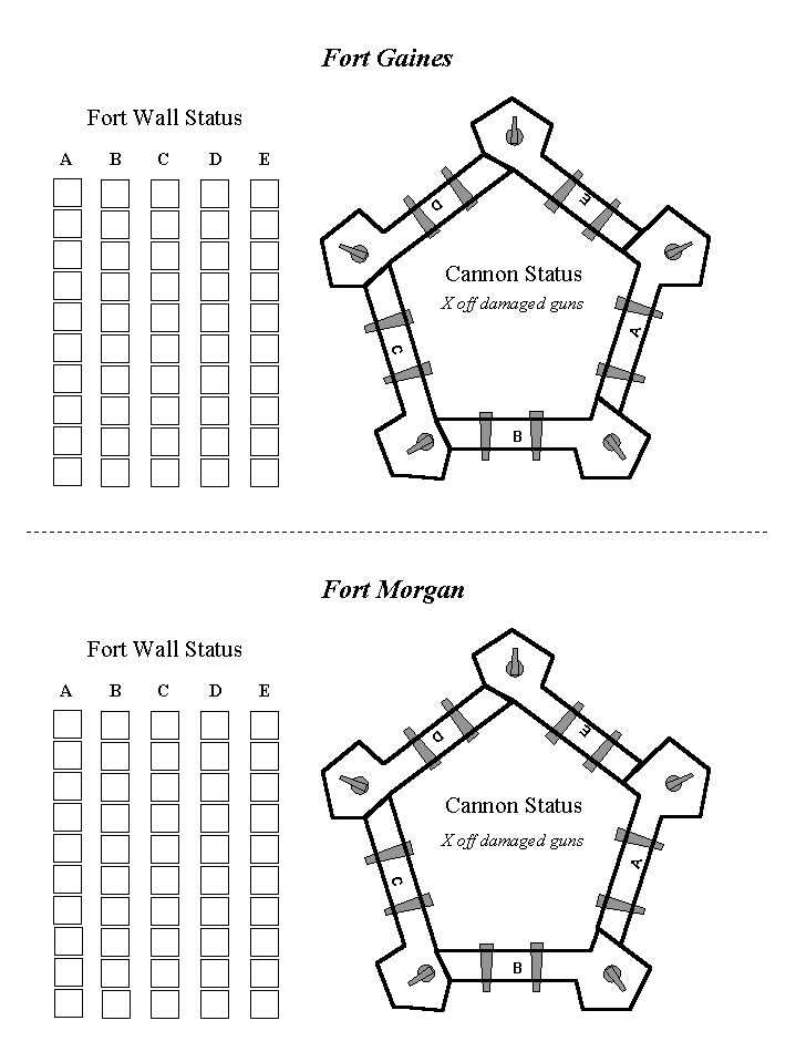 Forts. Players who lose ships can man the forts and roll for submerged torpedo hits. Each fort is divided into five batteries, A to E. Each battery fires and defends in the same manner as ships. Each battery consists of 2 casement guns which can pivot up to 45 degrees either side of centerline, and one cannon mounted on top of the bastion capable of firing 360 degrees. When firing on ships, battery rolls 1d6 for each gun able to bear. When defending, the fort walls are treated the same as 10 inches of armor. When attacked, the battery struck is determined by rolling 1d6. 1 = A, 2 = B, etc. 6 = defender choice. Damage within a battery (gun vs. wall) is determined by defender and marked on the fort status sheet.