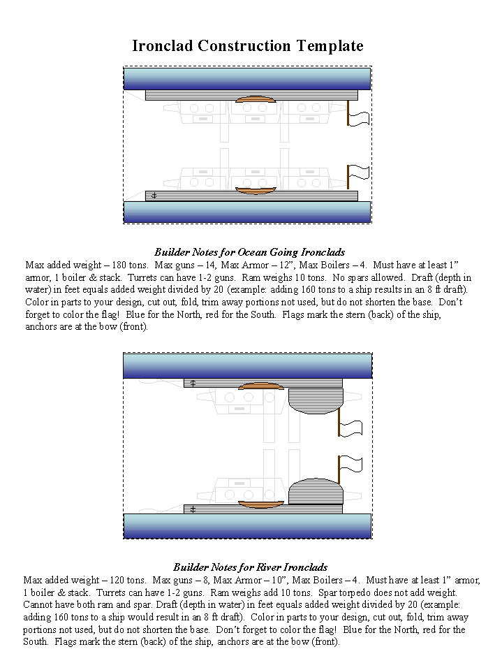 Ironclad: After deciding on an ironclad class, darken the outlines and color in those portions of the ship template that correspond to your design. If your ship has guns on both the right and left sides of the ship, ensure you color in the right number of gun ports. If a turret has only one gun, color in the fore or aft facing gun, otherwise color in the two side spots (on one side only! Remember, the turrets can turn, so don't worry about which side the guns are colored in on.). Other building tips are on the templates. You can add extra items like masts, rigging, and additional flags that are not on the template, but no additional guns, armor or stacks other than those already on the template.