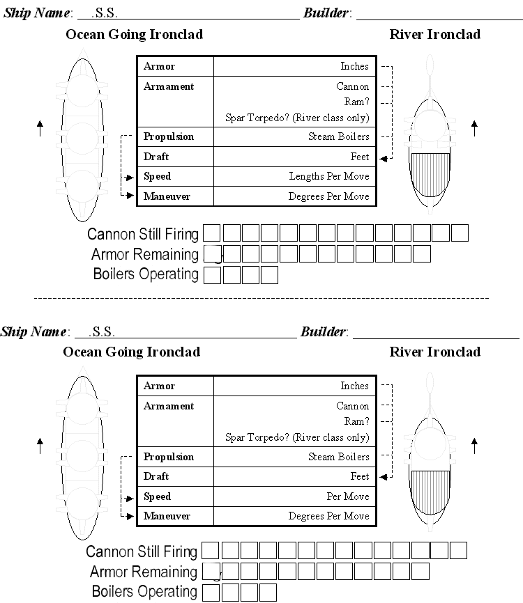 Displacement and Draft: Builders may add an additional 180 tons to the basic hull of the large Ocean-Going Class ironclads and 120 tons to the smaller River Class ironclads. Every cannon, overall inch of armor, steam boiler/furnace, and ram adds 10 tons. A ship sits in the water (draft) as deep as the total added weight divided by 20, rounded up (adding 150 tons to a ship would result in an 8 ft draft).