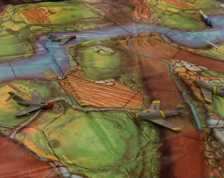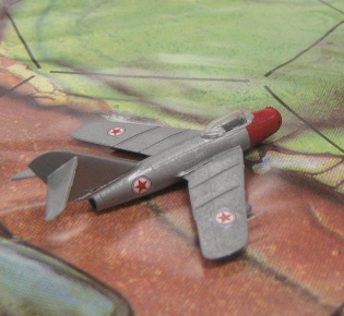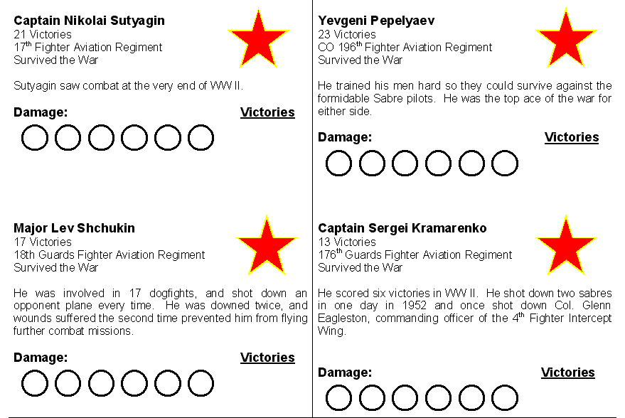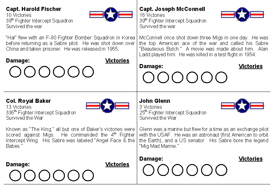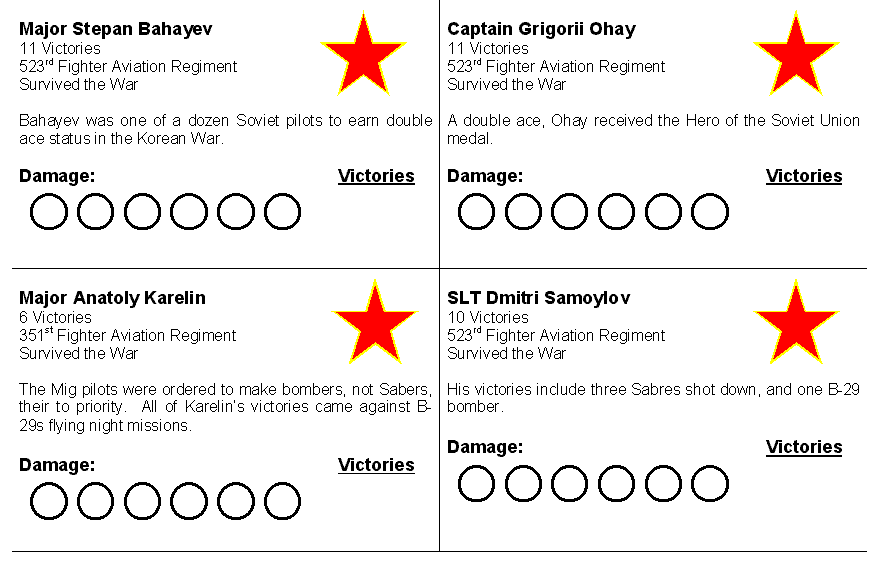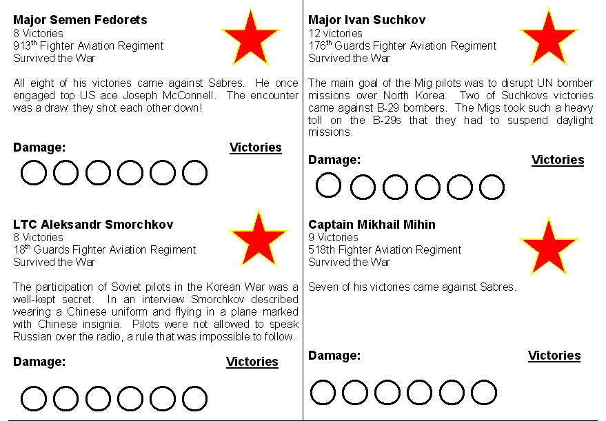 Optional Rules: The Mig-15 and Sabre had different strengths and weaknesses. You can model some of the differences with some simple changes. The Sabre was armed with six .50 machine guns, which did less damage than the Mig's cannons. Give the Mig one extra damage point. The Sabre was more maneuverable than the Mig, so remove one Hard Right and one Hard left from the Mig's maneuver deck.
