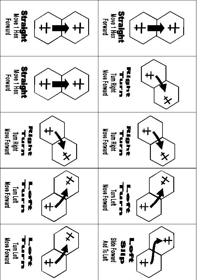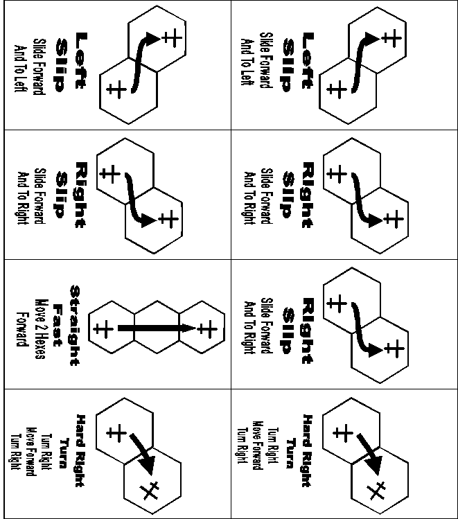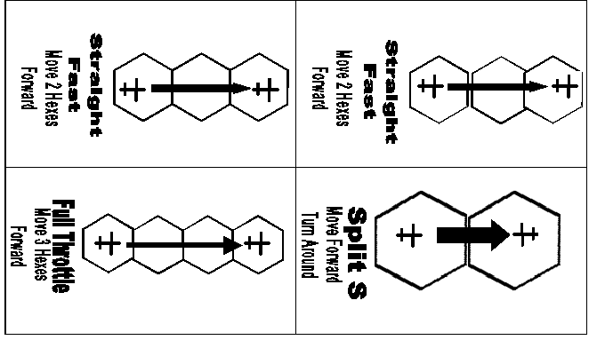 Choose Cards: At the start of the turn each pilot must select three maneuvers from his deck of maneuver cards. Note that there is only one card for some maneuvers so these may not be used more than once per turn. The pilot should try to anticipate the maneuvers of his opponents and plan accordingly. The three cards selected should be placed face down in a stack in the order they will be used, the rest of the cards should be set aside. At the start of each new turn the three cards that were used are returned to the deck and may be selected again for the new turn. Normally everyone gest a deck with the same cards, but see the optional rules for a different method you can try.