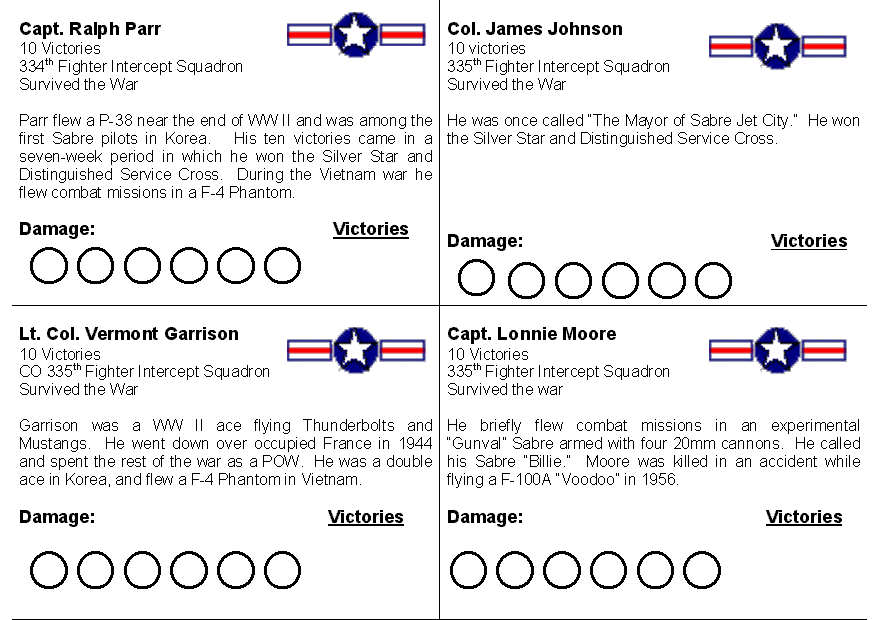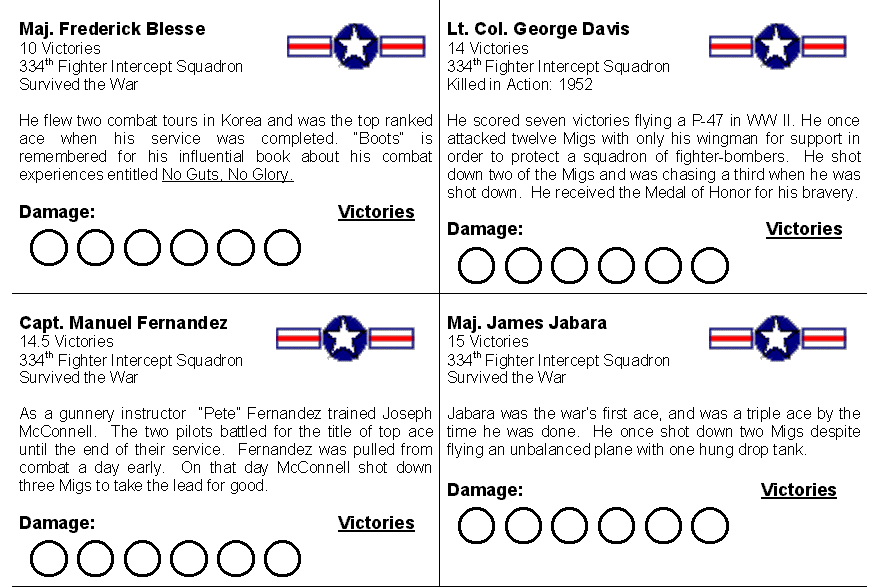 Pilot Licenses: The pilot license is a sheet, about the size of an index card, where the students can record the damage to their planes and record their victories. They were designed to resemble baseball cards, with the name of a Korean War ace, his victory total, and a brief biographical blurb. The sources used in creating the licenses are listed in the resources section at the end of this page. The two most useful sites were Korean War Aces and American Aces of WW II. I laminated the pilot licenses so they could be marked with dry erase markers. They should be printed in landscape mode. You can download the pilot license cards as MS Word files: sabrepilots.doc, migpilots.doc.