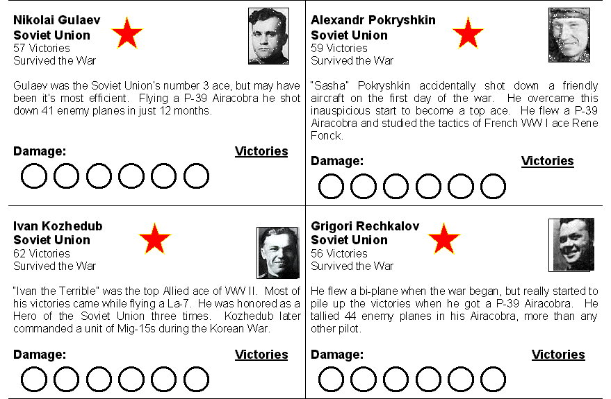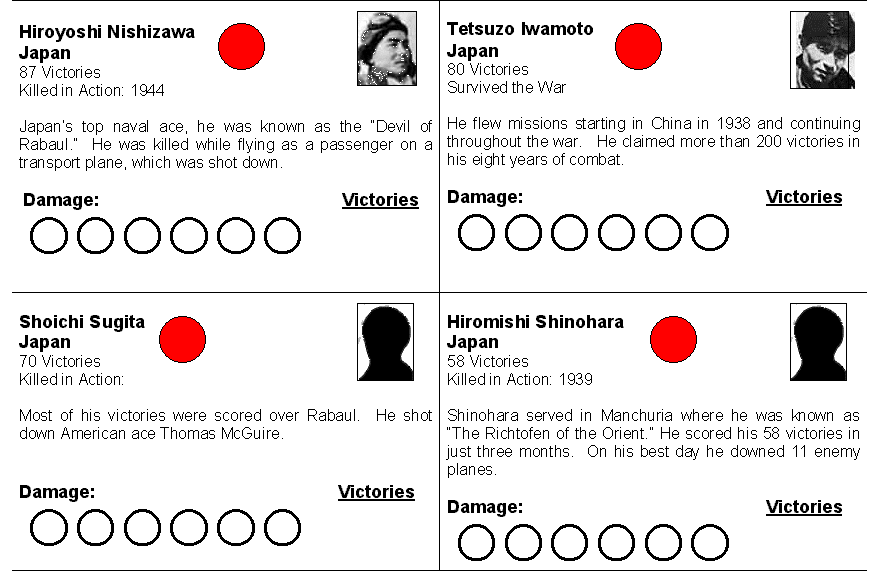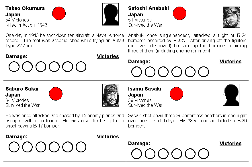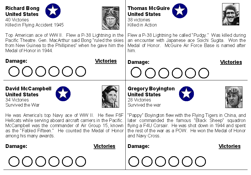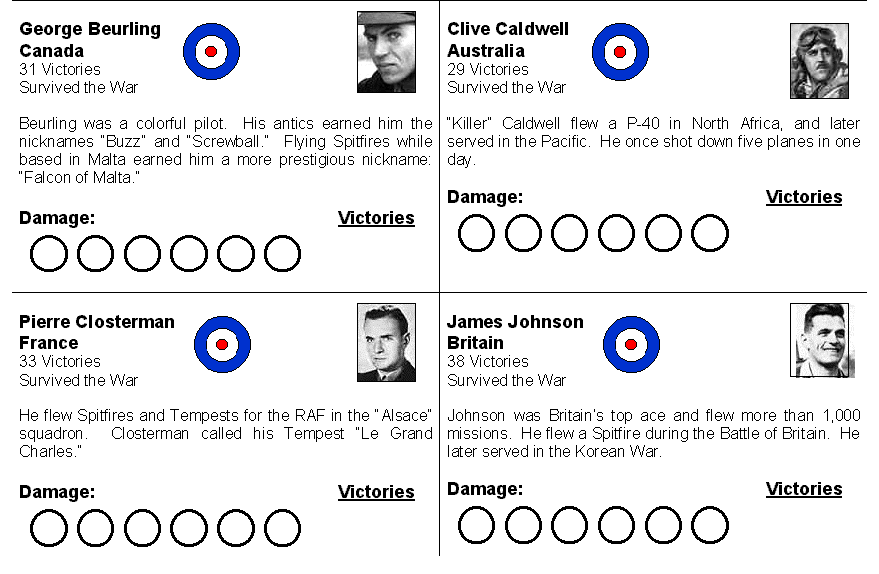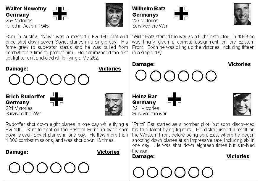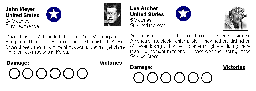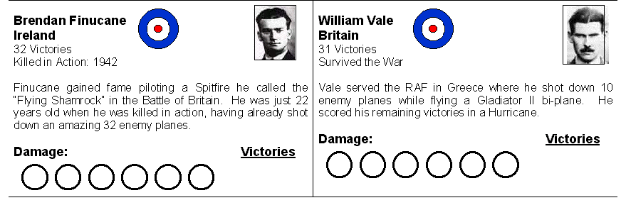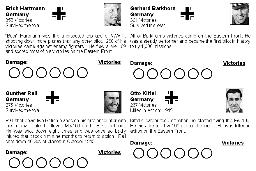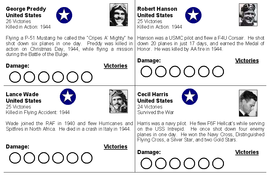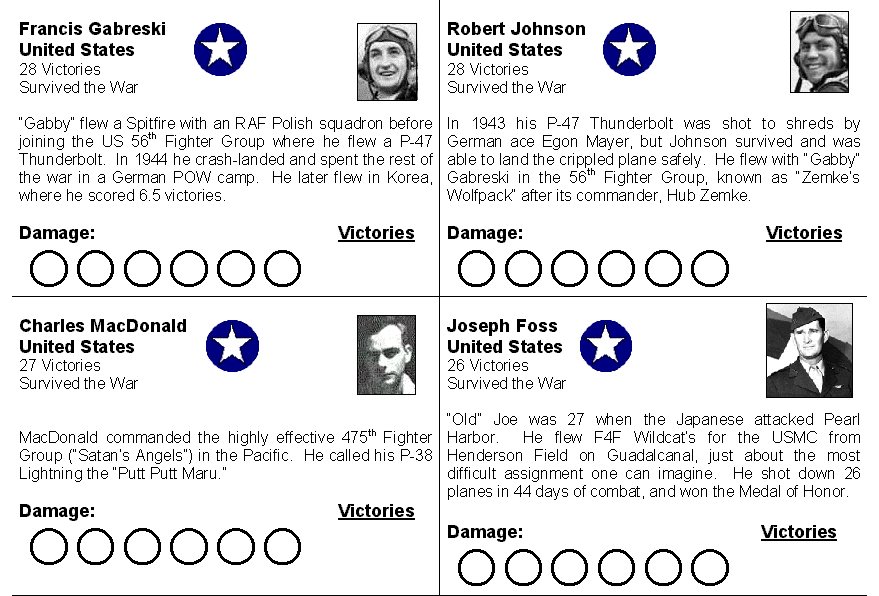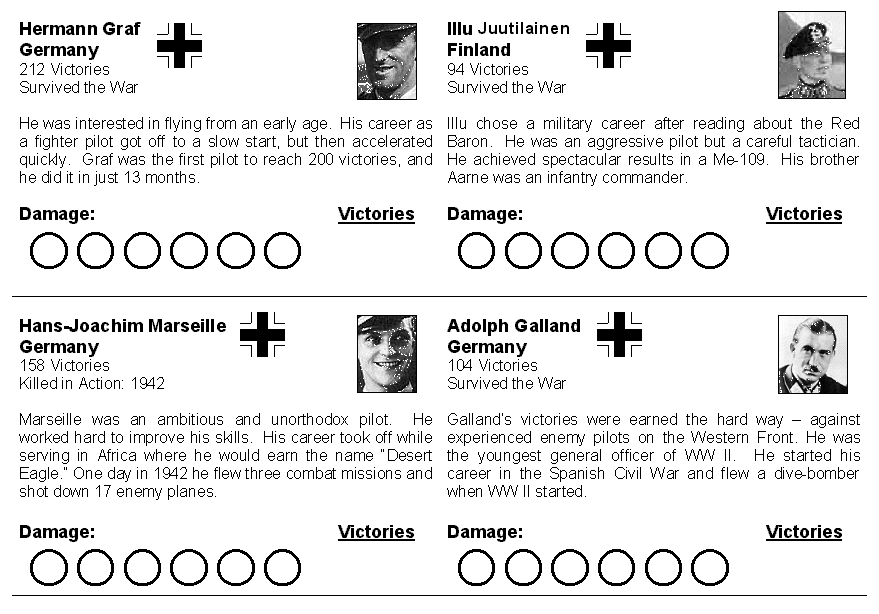 Aces: When a pilot gets 5 victories they become an ace. Ten victories is a double ace. When a pilot becomes an ace they get to throw one extra die each time they fire at an enemy plane.