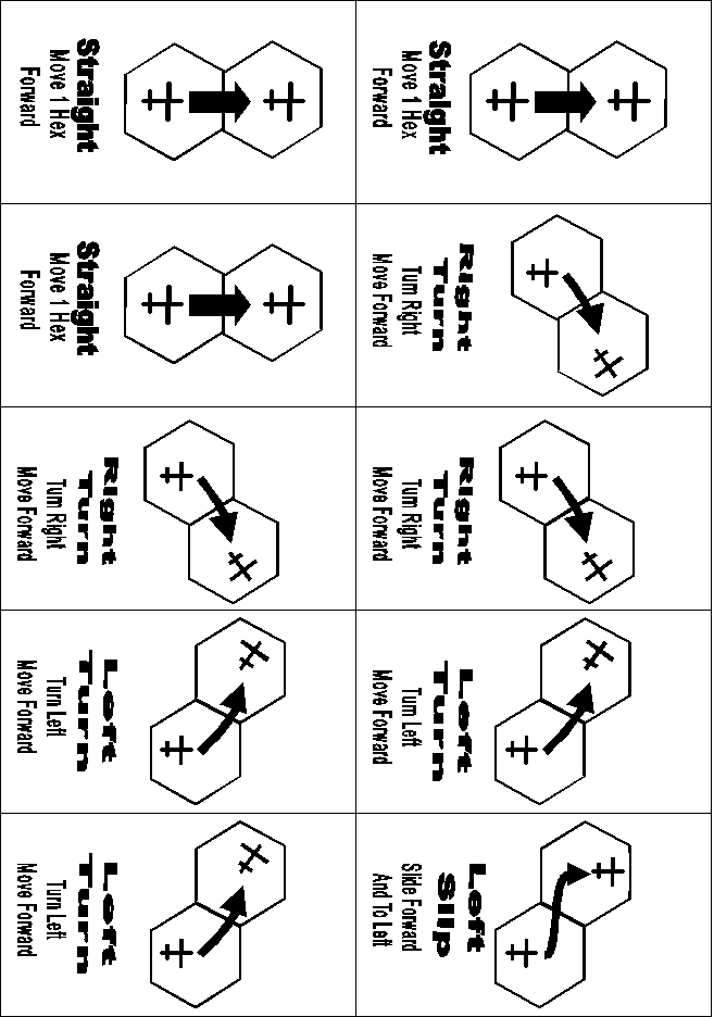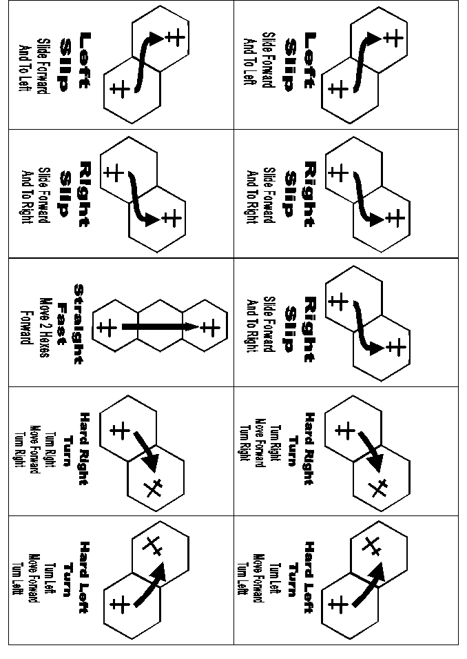 | Key: * = no change, HR= Hard Right Turn, HL = Hard Left Turn, R = Right Turn, L = Left Turn, 3ST = Straight Fast three hexes | ||||