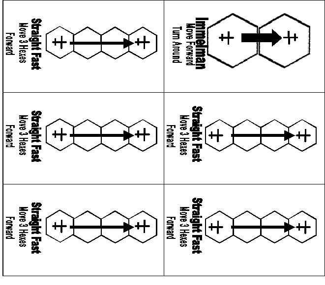Choose Cards: At the start of the turn each pilot must select three maneuvers from his deck of maneuver cards. Note that there is only one card for some maneuvers so these may not be used more than once per turn. The pilot should try to anticipate the maneuvers of his opponents and plan accordingly. The three cards selected should be placed face down in a stack in the order they will be used, the rest of the cards should be set aside. At the start of each new turn the three cards that were used are returned to the deck and may be selected again for the new turn. Normally everyone gest a deck with the same cards, but see the optional rules for a different method you can try.