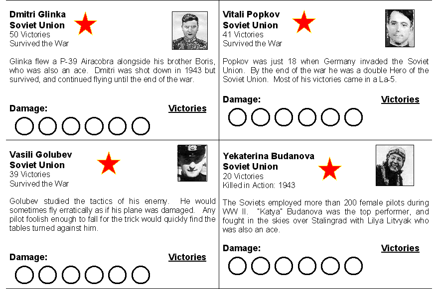 Victories: The pilot that shoots down an enemy plane is credited with a victory. If two planes hit a target on the turn it is shot down the victory is awarded to the player doing the most damage. If both players inflicted equal damage they each roll a die, high roll gets the victory (re-roll ties).