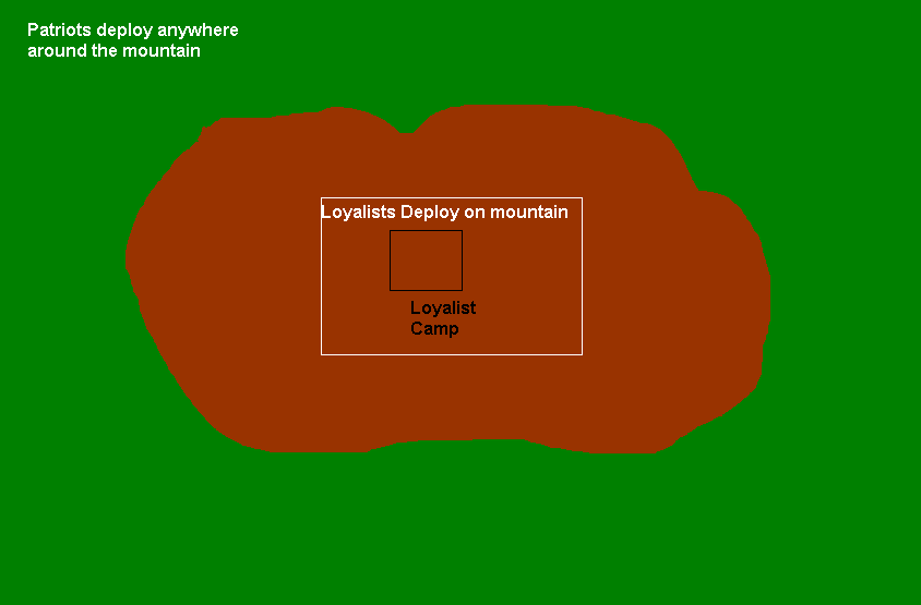 The Board: The Battle was fought on a mountain which is oval shaped. The Loyalists had made a camp on the summit but had little defenses. The table should be 2 meters by 1 meter. The area was forested which can be recreated by model trees, or deep green felt. If you choose not to model the trees it will not affect game play. The hill should be represented by darker felt. The Loyalists start at the top of the hill, the Patriots at the bottom surrounding the entire hill.