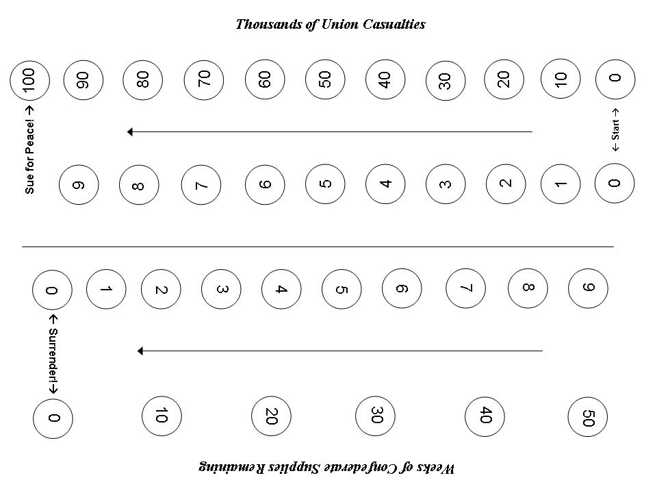 Scoring Example: In a single pair of facing players, the Northern player ends the previous turn with his navy card “Strengthen Blockade” and his army card “Campaign” in play. The Southern player has his navy “Raid Commerce” card and his army “Campaign” card in play. Each player picks one card from his hand and places in face down before him. When ready, both players flip their new card over. The Southern player reveals a “Garrison” card, while the Northern player has played “Pursue Raider.” Looking at the tops of the navy cards, -2 weeks worth of southern supplies match, and -2 weeks of Southern supplies and 5,000 Northern casualties match on the army cards. Net result: South loses 4 weeks from their counter, North adds 5,000 casualties to theirs. Here is a simple score card; use pennies to keep track of the score.
