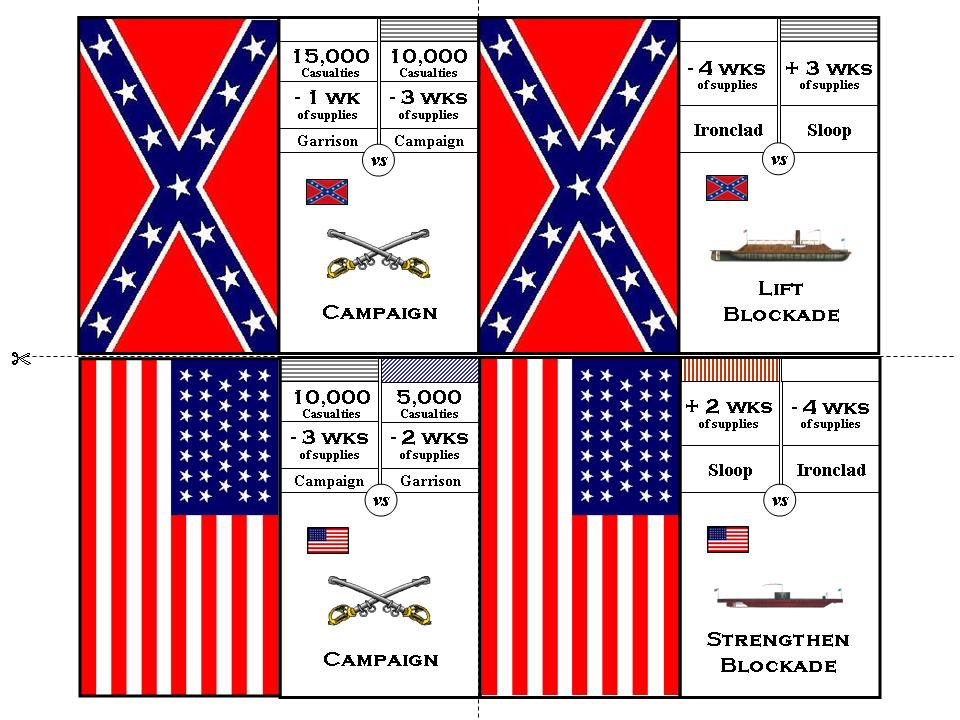 Play: Players start by placing their Army Garrison card and their Navy Raider in front of them, head to head with their opponent’s army and navy cards. Each turn commanders can elect to change one of their strategies, i.e. replace either their current army card with the one in their hand, or change out the navy card. Players must have one navy and one army card in play at all times. After deciding which card to change, the new card is placed face down in front of the player. Once their opponent has selected their card, both new cards are flipped over and the appropriate old card placed back in their hand. Notice that at the top of each card, only one color (or if the cards are printed in black and white, one patterned) area will match the corresponding area on their opponent’s card. This indicates the outcome of that card pairing. Players then tally up the results for BOTH their navy-to-navy pairing and army-to-army pairing based on either the score on the cards, or by using the Scoring Table card. Note that naval action only affects Southern war stocks, while army action affects both stocks and Northern casualties.
