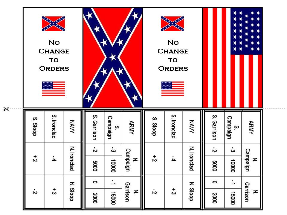 Set Up: Players of the same side sit side by side on one side of a table (or the floor), facing their opponents. Each player along the line plays a regional military commander with one army regiment and one navy squadron assigned to his control. Players can assume the identities of historic Union and Confederate generals and admirals, or simply be referred to as Commander 1, Commander 2, etc. down the lines. This opposing line of players stretches from Virginia down the southern Atlantic and Gulf Coast to Texas and then up the Mississippi River Valley. Any map of the eastern United States can be used, or an outline of the coast created with masking tape, but is not required for play. Each commander has six cards; two navy, two army and two special cards described below along with representative interactions from the Civil War: