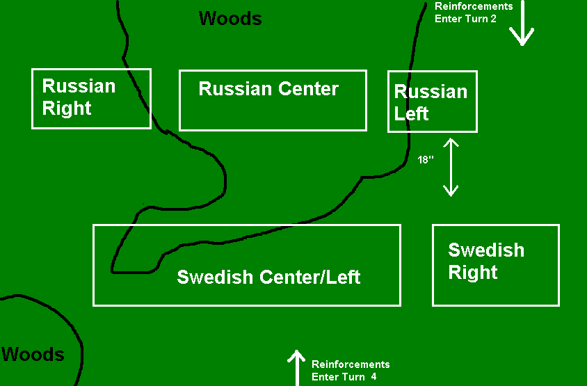 Deployment: This scenario begins shortly before the arrival of Russian reinforcements. Historically the reinforcements forced the Swedes to retreat to their wagon line around their camp, and the the Swedish reinforcements arrived too late to be of much help. The armies should deploy as shown on the map. Units should be placed at least 18" away from enemy units, facing their nearest opponents.