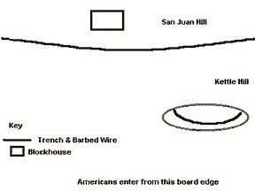 Set Up: The Spanish must be in the trench lines on San Juan Hill or Kettle Hill. Six Figures can fit in the blockhouse. The Americans start at the opposite end of the board.