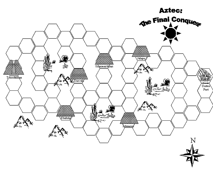 Neutral Cities: There are three armies in each neutral city at the start of the simulation. If Cortes or an Aztec army enters the neutral city then the armies in the city will join that side. The exception is Tlaxcala. They are enemies of the Aztecs and will not join them. If an Aztec army lands of Tlaxcala they must fight a battle. The Aztecs may also attempt to gain control of the armies at a neutral city by sending out diplomats.