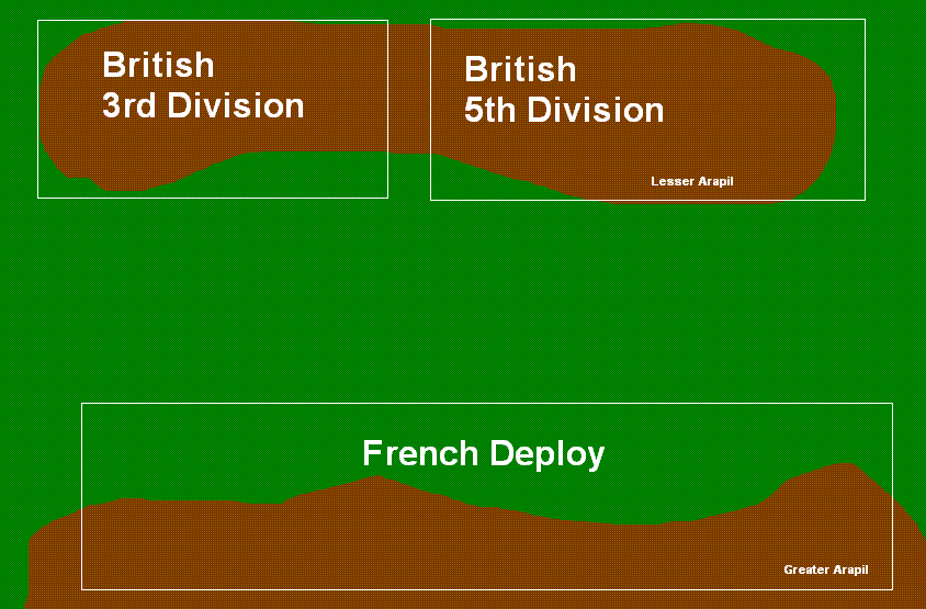 The Board: Salamanca was fought on a plain which was dominated by two hills which the local Spanish people call Hermanitos (two brothers). The British right flank was deployed at the base of the Lesser Arapil and 600 yards to the south is the Greater Arapil which is 300 yards long. This scenario is based on the British 3rd and 5th Divisions advancing to drive the French off the Greater Arapil.. For the battle, a table of 1.5 meters by 1 meter. Both hills must be modeled either with cloth or paper pieces.